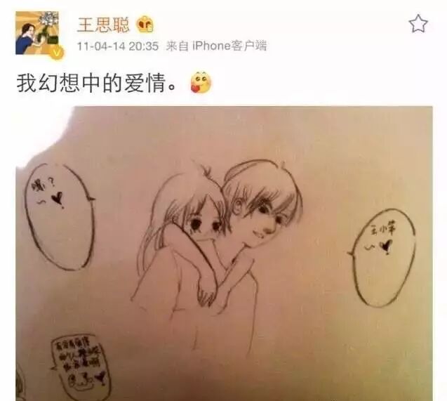 那时候的思聪还是纯情少年一枚,憧憬纯爱,待人和气,沉浸在爱恋的喜悦中。王颖生日的时候,思聪还专门画了一副漫画表达心意,他叫王颖“王小笨”。完全玛丽苏男主附体。