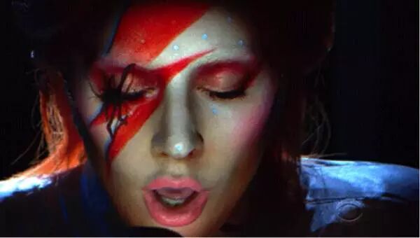 在今年格莱美的演唱中,Gaga向已故英国摇滚音乐家大卫鲍伊致敬,决定让鲍伊的经典造型在她身上重现。运用“数字皮肤”这一技术,展现了金色的油彩如水纹般在面部流动,凭空出现的蜘蛛在脸上攀爬旋转的惊艳效果。