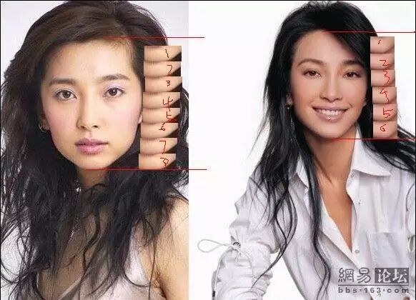 我们可以看到高圆圆和小s的比例都是正好的,下巴的长度占脸部的六分之一。但是有些明星看起来怪怪的就是下巴的长度不够。比如戚薇,戚薇的下巴太短了,是脸部的七分之一。