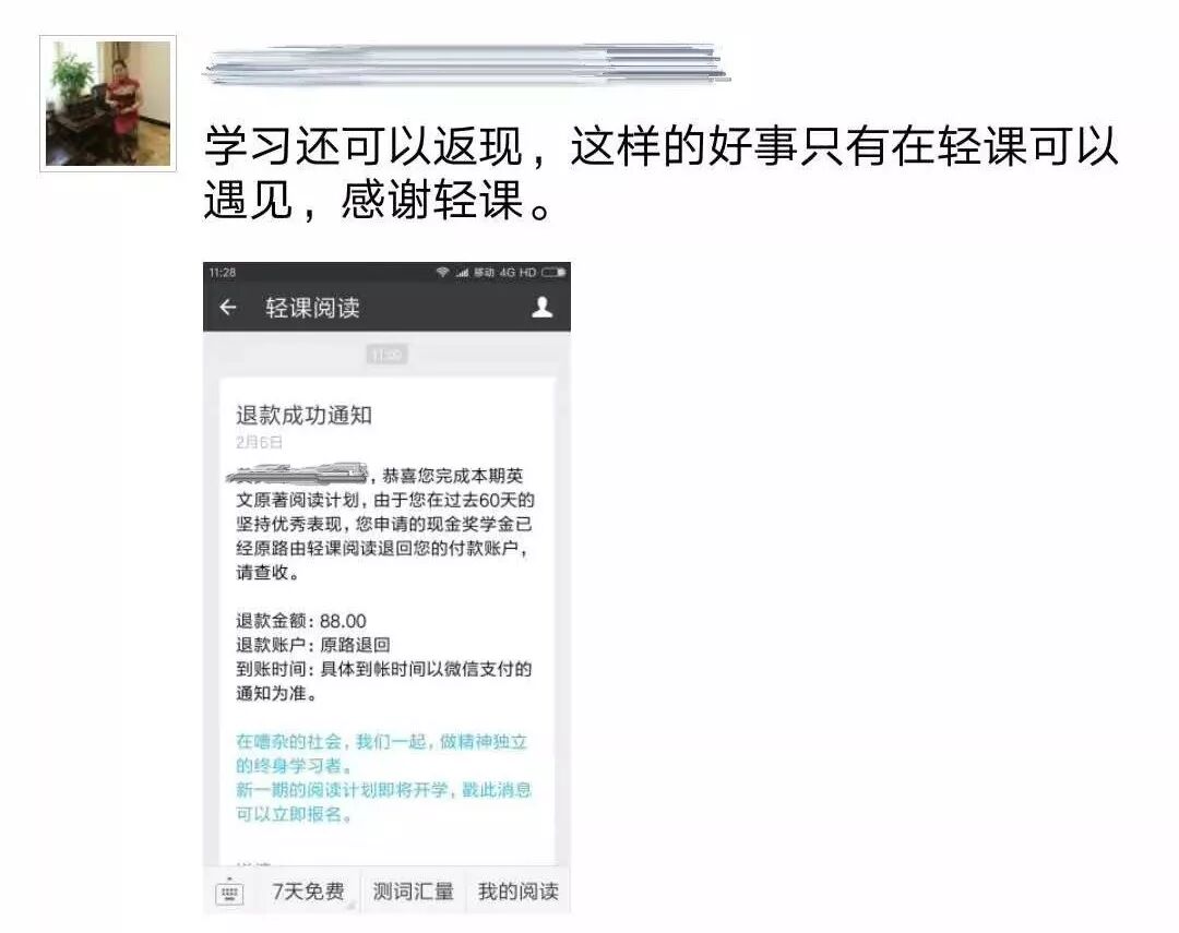 所有报名这个活动的同学,学习积极性远远高于普通学员。现在已经有90%的学员完成了前面几期的阅读计划,退回了80%的学费,并得到了一个英语蜕变的自己。