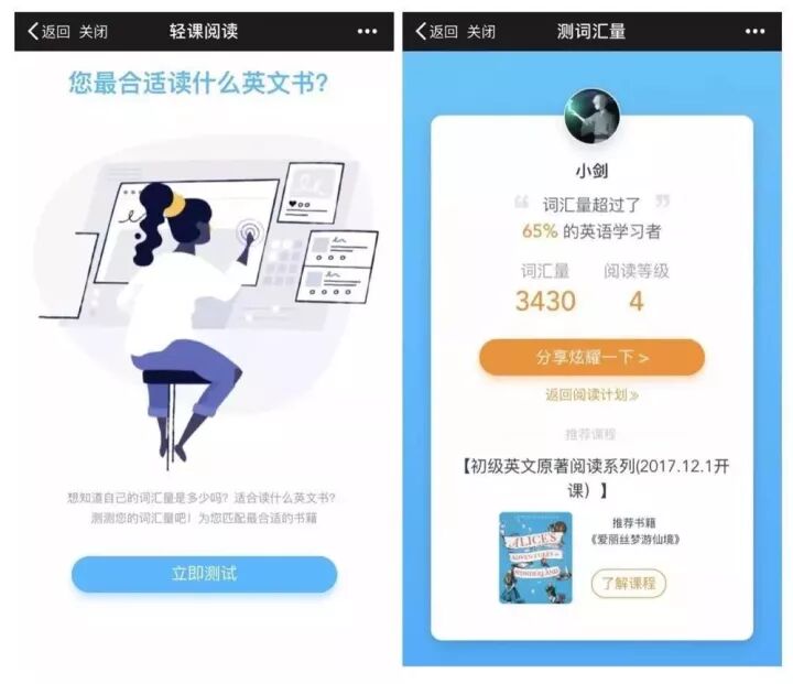 轻课阅读计划会对每一位学员进行词汇量的测试,根据测试的结果,个性化地推荐最与你匹配的(i+1)阅读书籍。