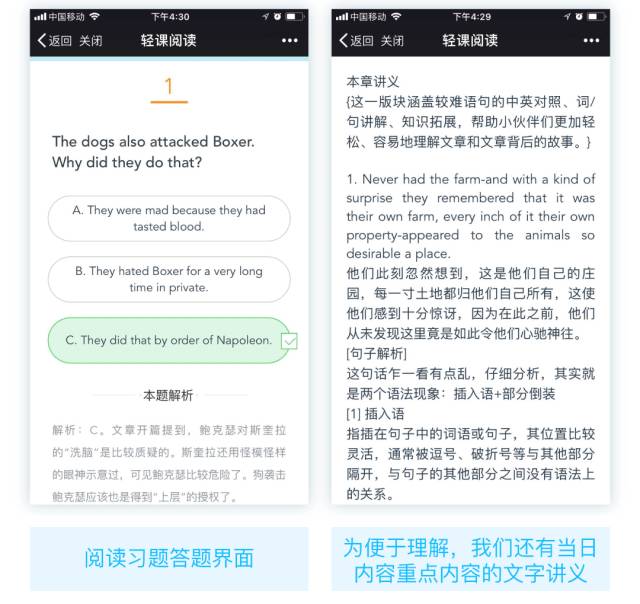 因此,每篇文章结束后,为了帮助大家提升学习效果,轻课阅读计划都会有针对性习题,精准回顾归纳,想要遗忘都困难!