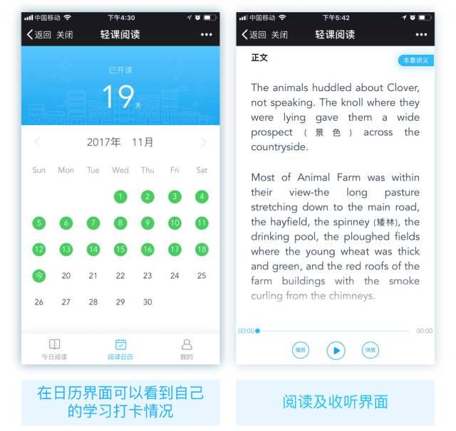轻课阅读计划通过文字+外教原音的方式,听、看、读的结合成为目前最有效的方式之一。