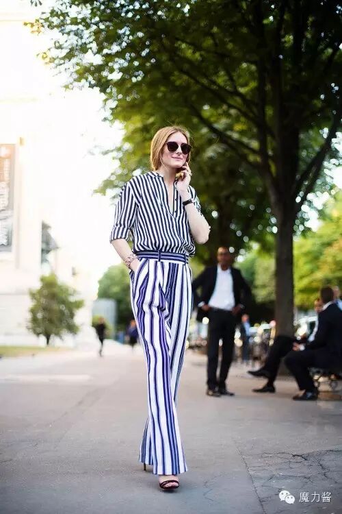 很爱用条纹搭条纹,或者条纹波点条纹各种混搭元素的Olivia似乎深谙搭配之道,窄条纹衬衫配宽条纹阔腿裤,层次感极强,身材比例完全被修饰的天衣无缝,通勤扮潮也毫无压力...