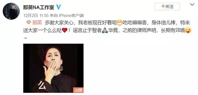 而在昨晚,工作室也是终于发声了,多谢大家关心,我老板现在好着呢,吃吃嘛嘛香,身体倍儿棒,特来送大家一个么么哒!谣言止于智者,毕竟,之前的律师声明,长期有效哦。