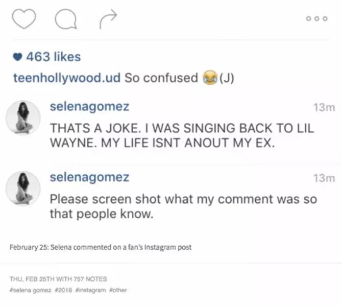 “I want to delete my Instagram,” Selena captioned, exhausted from fighting off the masses from her post. She followed up that she wasn’t singing to Justin but as a joke to the song’s creator Lil Wayne. She finally capped off her argument by once again letting her feelings about Bieber known when she captioned, “My life isn’t about my ex.”