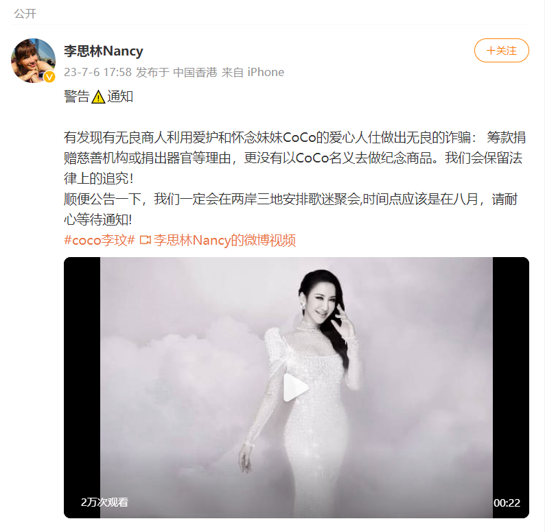 7月6日傍晚,李玟姐姐李思林再发文,称发现无良商人以筹款捐赠慈善机构或捐出器官等为理由,利用爱护和怀念妹妹CoCo的爱心人士做出无良的诈骗,她表示也没有以CoCo名义去做纪念商品,提醒网友们警惕相关行为。