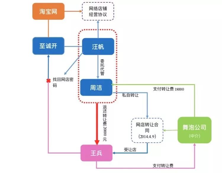 本案中,汪帆系通过与淘宝平台签订服务协议并经实名认证,取得系争网络店铺之经营权。服务协议内容经双方认可,且不存在违反法律行政法规强制性规定、损害社会公共利益等情形,故汪帆与淘宝平台间形成合法有效的合同关系。现周洁在汪帆认可之情况下,与王兵、舞泡公司签署网络店铺转让合同,实际上系将汪帆与淘宝平台间合同关系项下的权利义务一并转让给王兵。根据《中华人民共和国合同法》第八十八条、第八十九条之规定,当事人一方将自己在合同中的权利和义务一并转让给第三方的,须经对方当事人的同意。现周洁虽有汪帆之认可但未征得淘宝平台同意,私自转让系争网络店铺,该转让行为不发生法律效力。故王兵以合同约定内容为据,要求周洁等支付违约金、双倍返还转让费之主张,缺乏依据。而根据《中华人民共和国合同法》第四十二条规定,当事人在订立合同过程中有违背诚实信用原则的行为,给对方造成损失的,应当承担损害赔偿责任。周洁在汪帆认可情况下,将系争店铺让与王兵,现转让行为未生效,且店铺已被汪帆找回并实际控制,周洁理应就王兵因此而产生之损失承担赔偿责任。