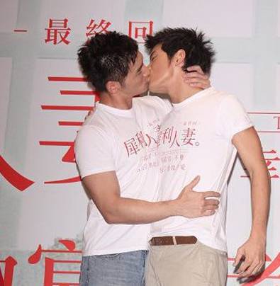 温升豪、宥胜之前为庆祝《犀利人妻》电影版票房开红盘,两人兑现承诺当场上演男男激吻的桥段。