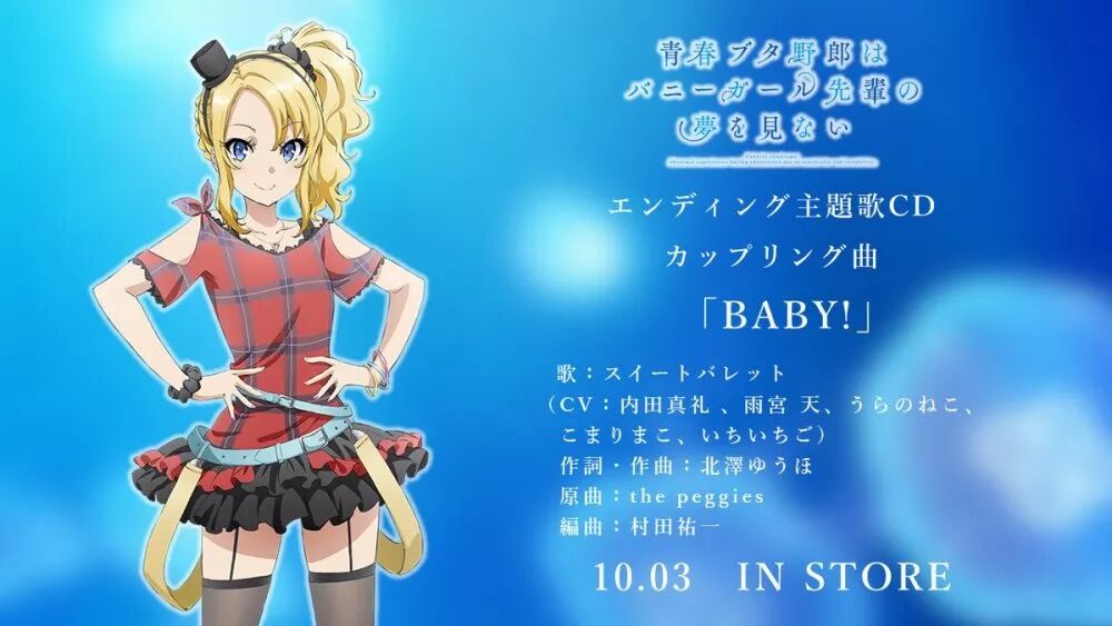 昨天官方还公开了该动画的OP主题曲详情。OP主题曲确定由女子乐队the peggies演唱,曲名为《君のせい》,该主题曲的单曲预定于2018年11月7日发售。ED主题曲的曲名为《不可思议のカルテ》,由樱岛麻衣、梓川枫、古贺朋绘、双叶理央、丰滨和花、牧之原翔子六位角色演唱,主题曲的单曲预定于2018年10月3日发售。昨天官方还公开了ED主题曲单曲中收录的C/W曲情报,由动画中的偶像组合“甜蜜子弹”成员丰滨和花(CV:内田真礼)演唱。