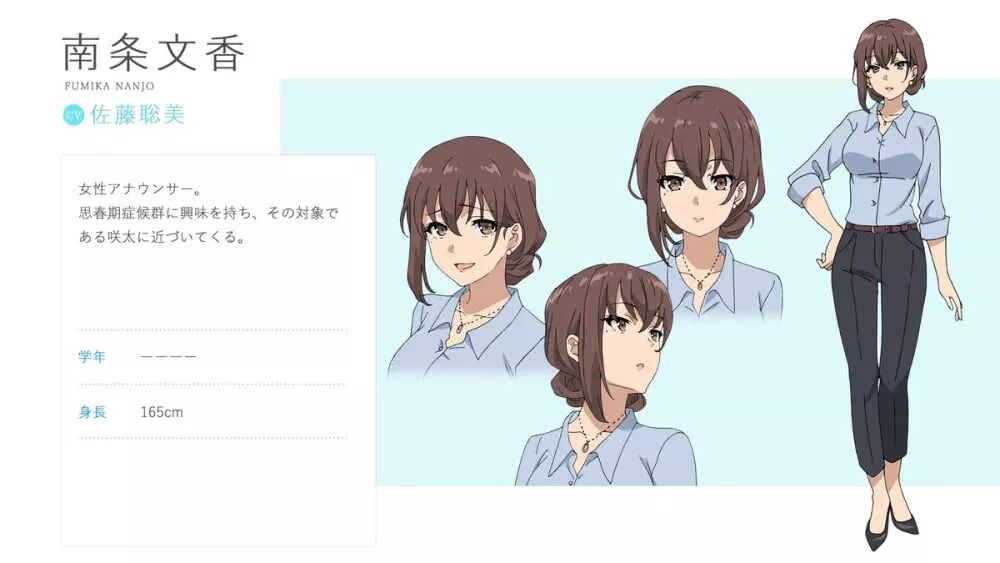 《青春期笨蛋不做兔女郎学姐的梦》的故事讲述了思春期症候群是一种多感、不安定、且只会发生在青春期的不可思议的症状。比如在梓川咲太面前出现了野生的兔女郎,她的真正面目是已经引退两年的女演员、目前就读高三的樱岛麻衣前辈。不知为何周围的人对她那充满了诱惑力的姿态不为所动。为了解开这个迷的咲太在与麻衣相处的过程中逐渐得知了她不为人知的想法,而咲太身边也陆续开始出现各种同样有“思春期症候群”的女生。在昨天公开的第2弹PV中可以看到多位角色登场,同时还官方公开了三位追加角色的配音声优和人设,下面就让我们来看看吧。