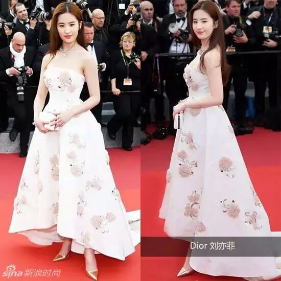 刘亦菲身着Dior迪奥高级订制礼裙,佩戴Dior高级珠宝Rose Bagatelle系列钻石手镯和项链以及Dior高级珠宝Rose des Vents系列白金镶钻戒现身第69届戛纳电影节开幕红毯。