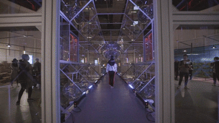 展厅最中心是一个闪闪发光的钢铁小屋,门只开了一条缝,探身进去,从上到下全是镜子,对面也是镜子。房间尽头挂着一个巨大的迪斯科球,blingbling的闪光,经过镜子的折射,基本可以闪瞎每个人的钛合金狗眼。