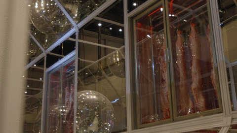 “这个作品刚好把夜店最有标识性的一个迪斯科球,和菜市场最核心的摊位——肉铺放在一起了,形成一种冲突感,一下子就打到了我。”