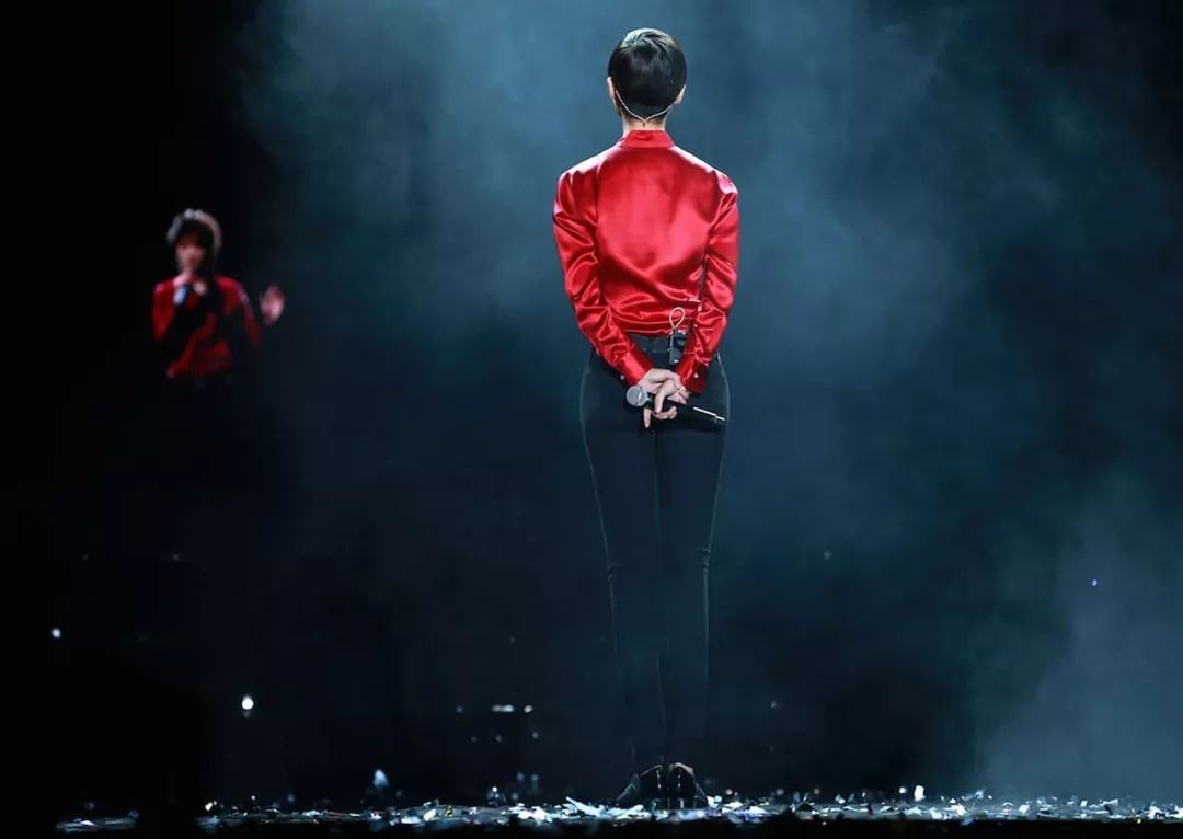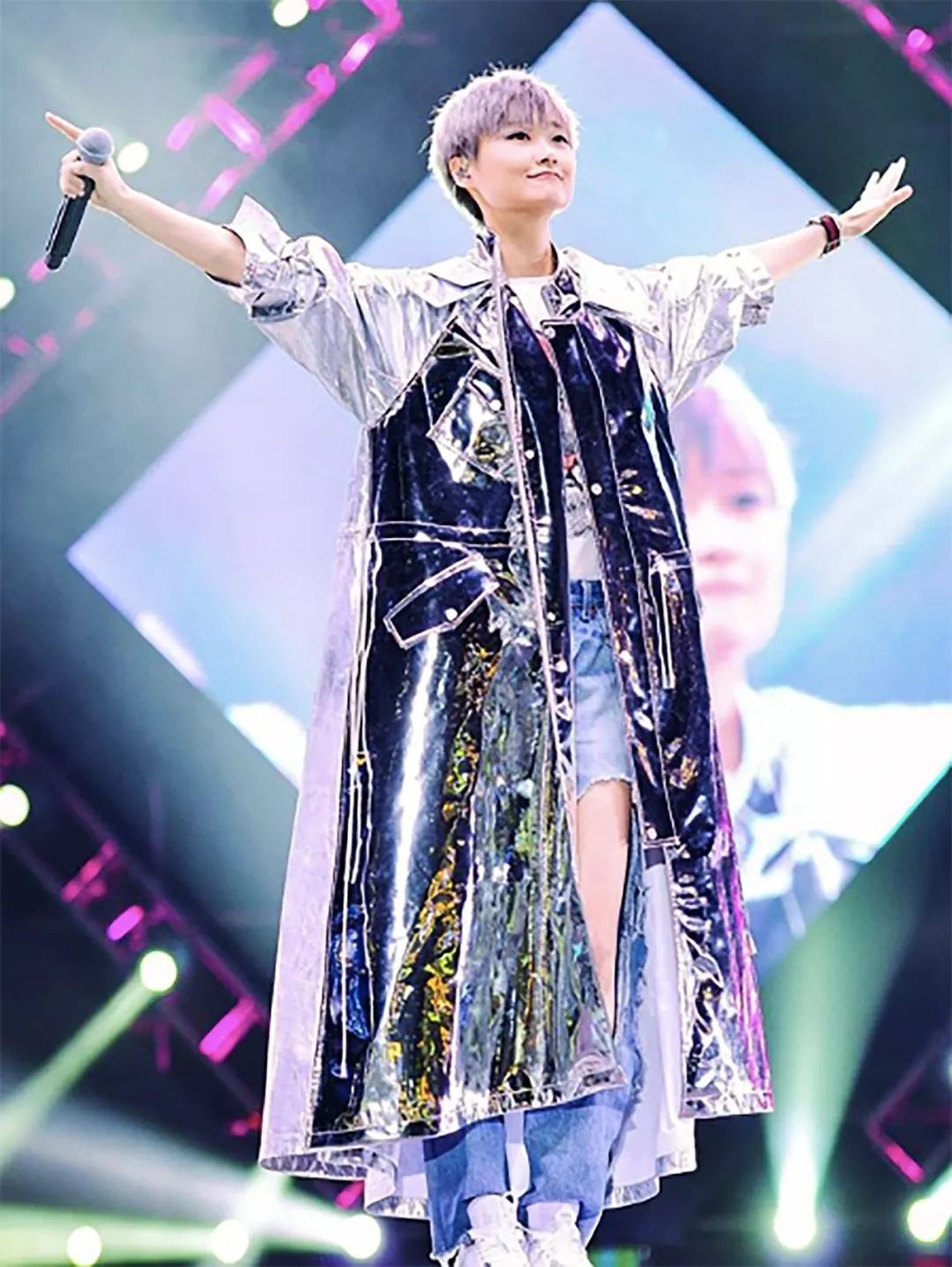 2015年,成都体育中心,出道十周年演唱会,唱最后一首歌前,李宇春特地换上了十年前第一场个人演唱会的演出服,她自嘲胖了20斤,衣服都有点紧了。