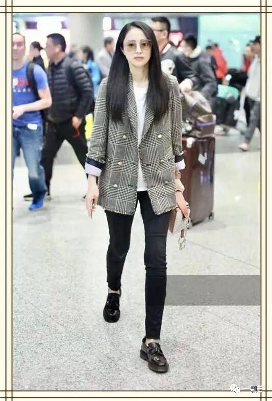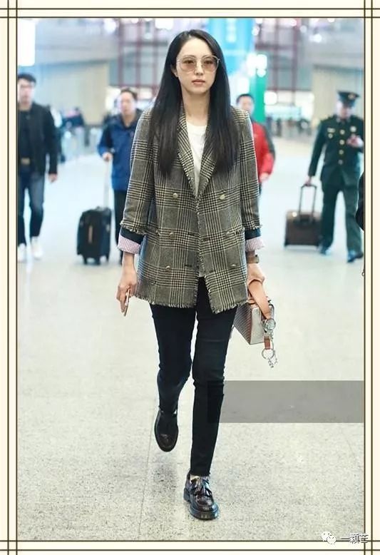 搭配上修身的黑色长裤的时候更是会衬托腿部线条十分的修长,加上格纹外套不但让董璇的气场显得更加的简洁干练,同时也显得身形纤细修长很多。