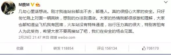 鹿晗则因无法出站而选择乘坐别的车辆去其他的站点下车,事后鹿晗也发出微博希望粉丝们不要再来接站。