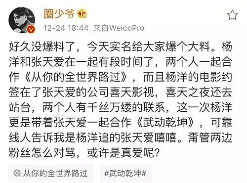 当初这部剧的幺蛾子不止这些,《武动乾坤》开拍后,张天爱和杨洋就传起了绯闻,说是杨洋要追张天爱。不过两个人那段时间的合作的确是非常频繁,除了《从你的全世界路过》、《武动乾坤》之外,还有合作的代言,这个代言可是张天爱从赵丽颖手中抢过来的,但两人之后还是没下文了!