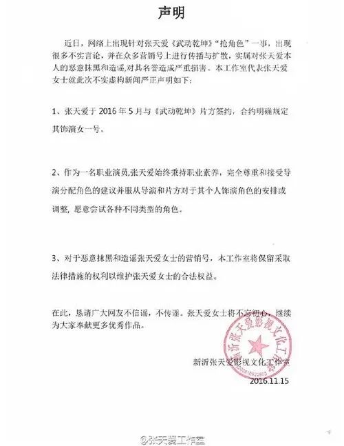 剧组导演张黎出面为张天爱澄清:“接触张天爱后觉得她还是适合应欢欢,这个角色非常重要,非她莫属。应欢欢最后把命给了对方,这样的角色需要强大的内心力量,相信小爱可以很好地诠释。”男主杨洋也表示很期待,张天爱方发声明说:签约的就是女一号,什么角色由导演决定。
