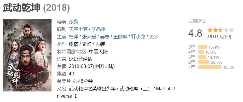 张黎导演可是手握豆瓣9.7和9.6分中国数一数二的神剧《大明王朝1566》和《走向共和》的神级电视剧导演。但是这部《武动乾坤》豆瓣评分只有4.8,非常不及格,可以说是张黎导演事业的滑铁卢了。