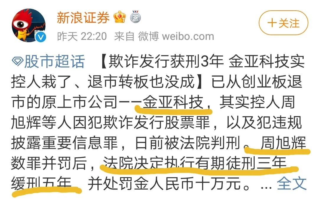 金亚科技实控人周旭辉,因欺诈发行股票罪,被判处有期徒刑三年缓刑五年。