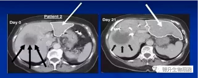 肝癌(肝右叶)部分肝切除患者,术前给予干细胞(CD133+)移植治疗(肝左叶),21天后肝左叶成倍增大。