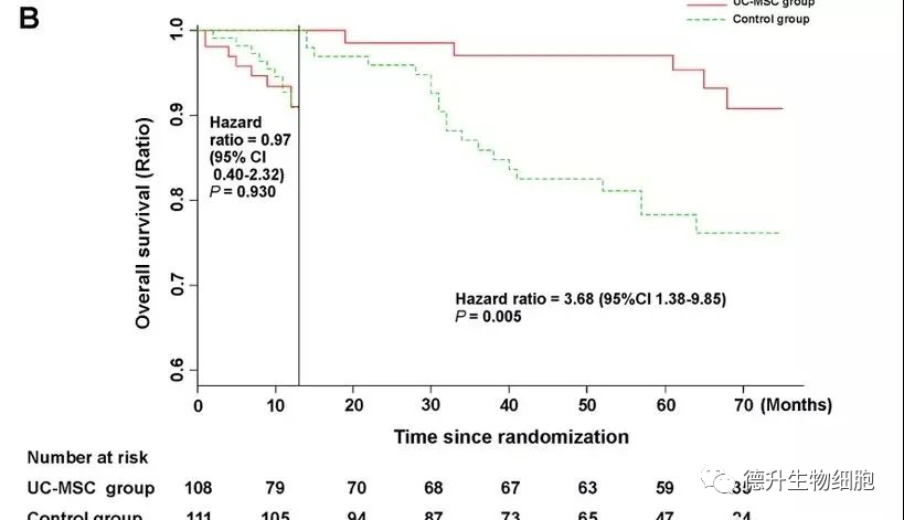 通过Landmark分析,在13个月至75个月的随访期间,脐带干细胞治疗组的总生存率明显高于对照组。