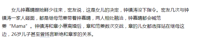 后来有媒体爆料说,钟小慧鲜少与女儿来往,现在都是继母范姜带着钟嘉晴,章和范姜数次交战,章的儿女都选择站在继母这边。