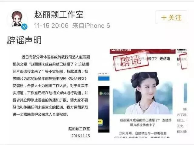 11月15日晚,赵丽颖工作室官方微博发表辟谣声明,称相关图片为赵丽颖多年前拍摄电视剧《极品男女》的花絮照,合影人士为剧组工作人员。工作室已与相关媒体沟通,要求立即停止谣言的传播和扩散,并请大家不要相信未经查实的报道。