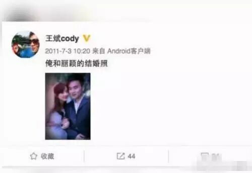 微博照片时间是:2011年7月3日,名叫王斌的,晒俺和丽颖的结婚照,结婚照中,赵丽颖也是一脸幸福的微笑。