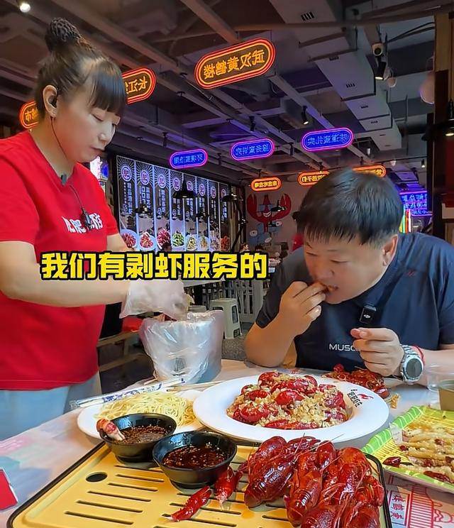 服务员看他烫得不行 主动上来帮忙剥虾 洪剑涛还推辞两句 说不用不用 结果服务员热情得拦都拦不住 他也只好笑着接受 一边剥虾一边感慨:“我在家都没这待遇啊” 服务员说:“我们店有剥虾服务的 而且不收费” 这一幕 说实话 真有点宾主尽欢的意思