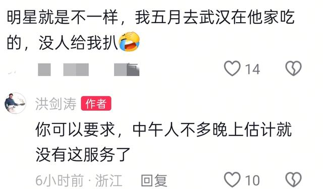 洪剑涛没躺平 赶紧出来解释:“你们可以要求 中午人少可以帮忙剥 晚上估计就没这服务了” 一句话堵上了所有的嘴 你看 这就是老江湖的处事智慧 他知道身为公众人物 任何细节都能被无限放大 一旦被坐实了“明星特权” 对店家和自己的口碑都是双输