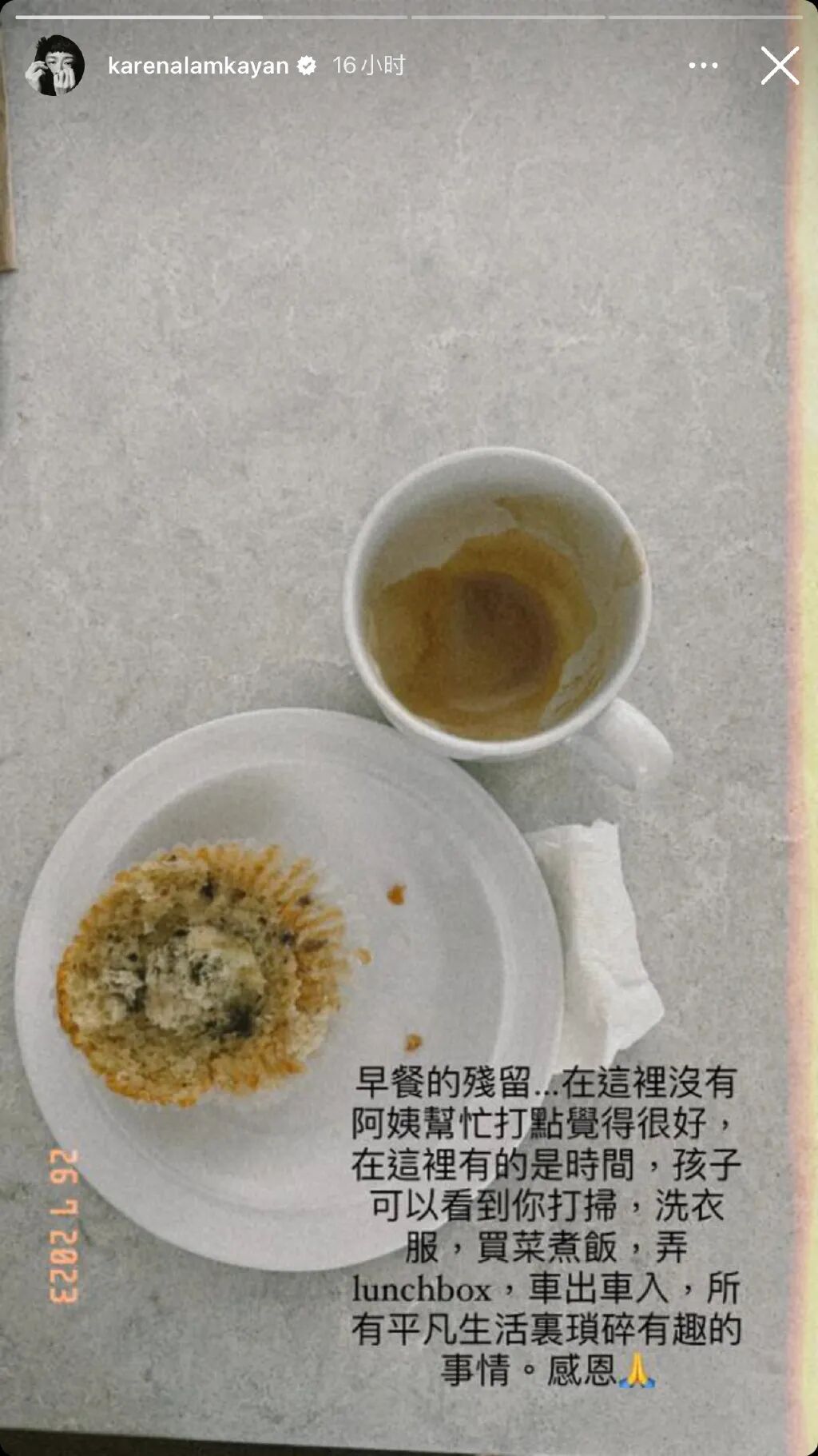 结婚生子后林嘉欣几乎是息影状态,离婚原因在她的社交平台分享日常中,可以看出端倪。全家人吃完早餐的残留,没有人打扫,全都丢给了自己。