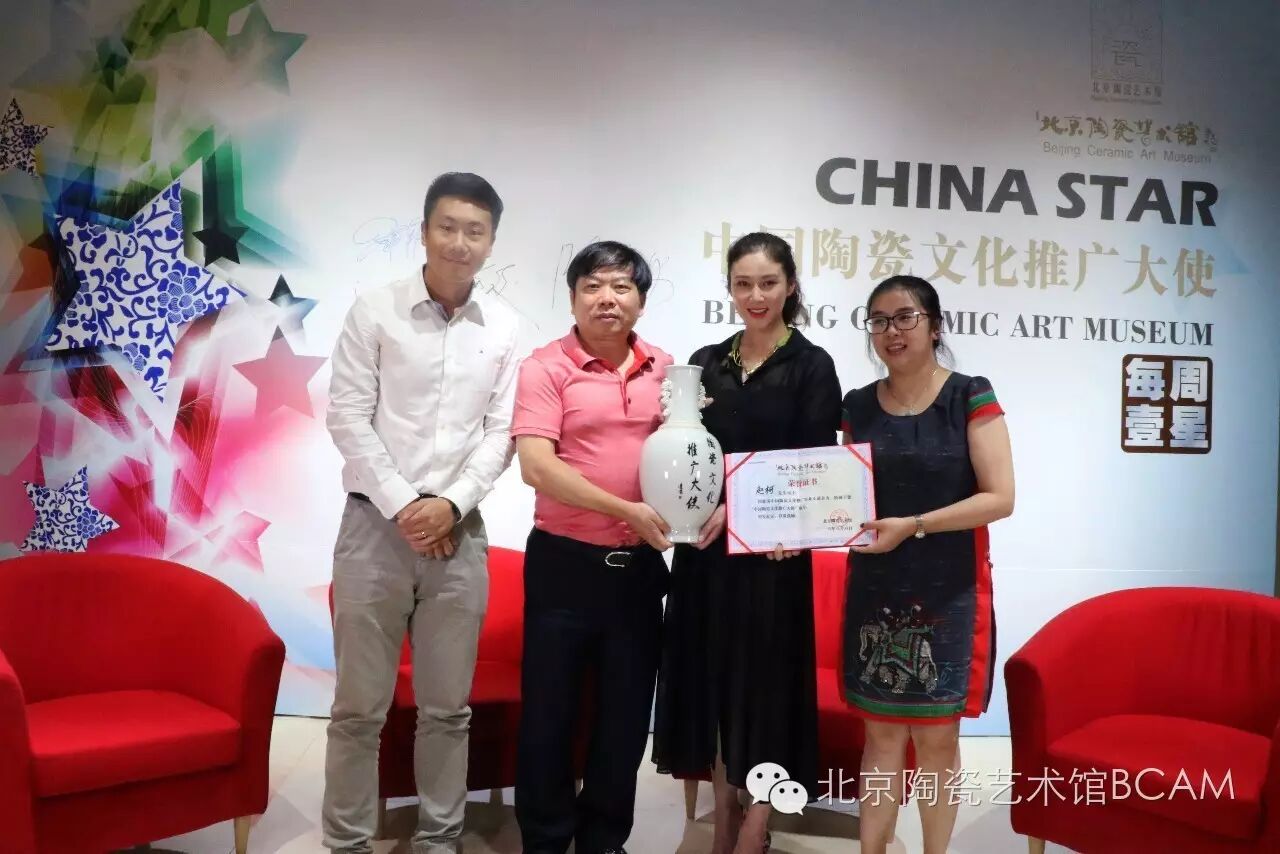 赵柯与北京市政协委员、闽龙集团董事长、北京陶瓷艺术馆馆长陈进林先生、副馆长陈美霞女士和王奕澄先生一起共话陶瓷文化传承。陈进林先生为赵柯颁发了“中国陶瓷文化推广大使”聘书及定制瓷器。