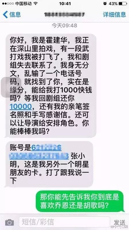 3月13日,微博一起颇具萌感的诈骗短信,短信称:「我是霍建华,我正在深山里拍戏,有一段武打戏我被打飞了……」而收到回复信息却是:「那你能先告诉我你到底是喜欢乔恩还是胡歌吗?」