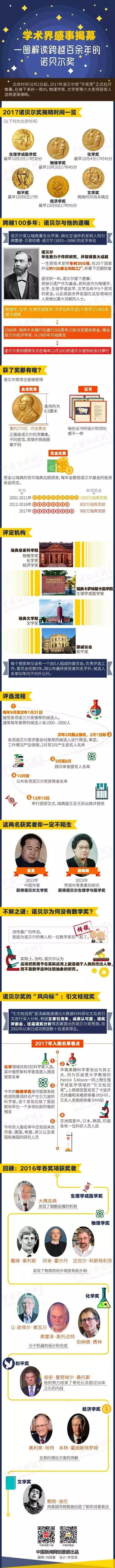 金秋十月的第二天,2017年诺贝尔奖颁奖周拉开帷幕,全世界的目光都聚焦到瑞典。在接下来的几天内,物理学奖、文学奖、经济学奖等奖项获奖者名单将逐渐揭晓。诺贝尔奖有何由来?它的背后又有什么不为人知的故事?有哪些学者可能金榜题名?一图解读跨越百余年的诺贝尔奖: