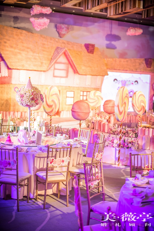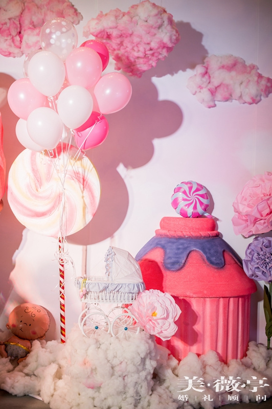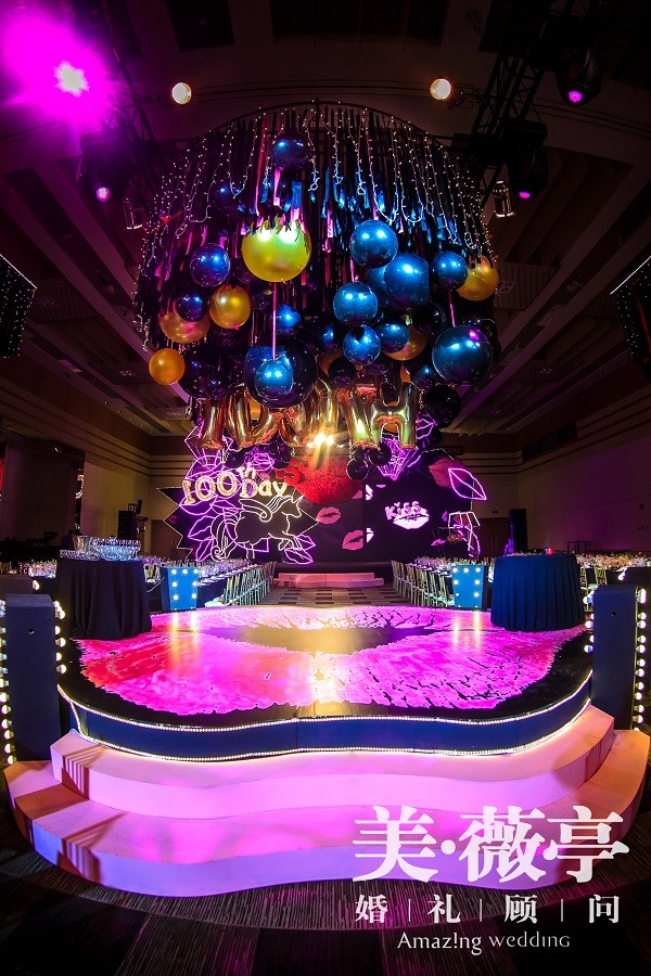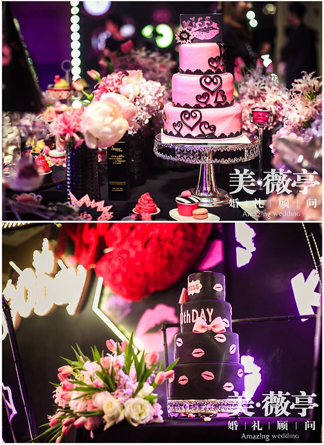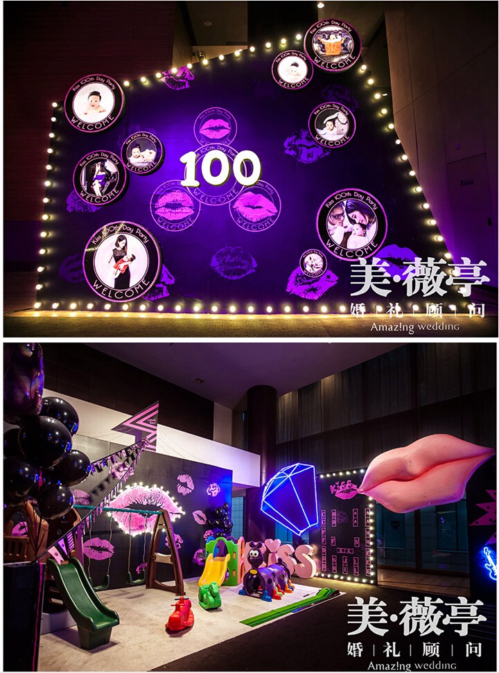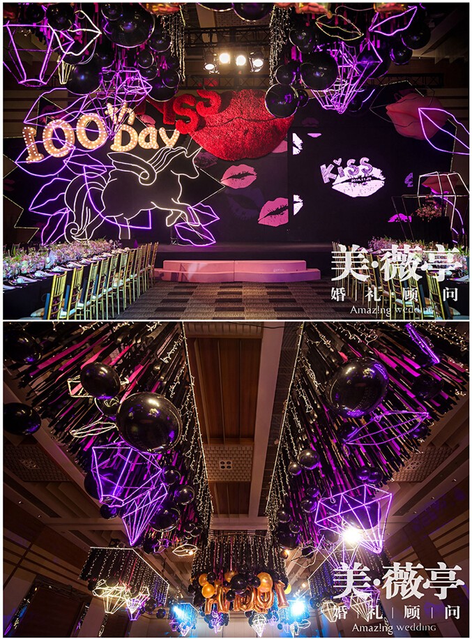 一个吻,在爱情的孕育下,萌芽升华成一个生命。他是爱的传承,也是诺言的守护。这是一场为新生命筹备的百日宴,所有的元素围绕着KISS展开。粉黑色的主调炫酷、大气。钻石香吻,满场飘香;天使独角兽,活灵活现。