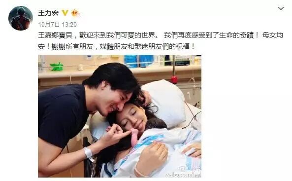 王力宏在微博中写道:“王嘉娜宝贝,欢迎来到我们可爱的世界。 我们再度感受到了生命的奇迹! 母女均安!谢谢所有朋友,媒体朋友和歌迷朋友们的祝福!”