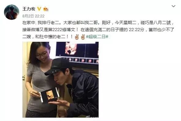 1 8月2日,王力宏晒出二胎B超照,称这是一个“超级二日”,难掩心中的兴奋。