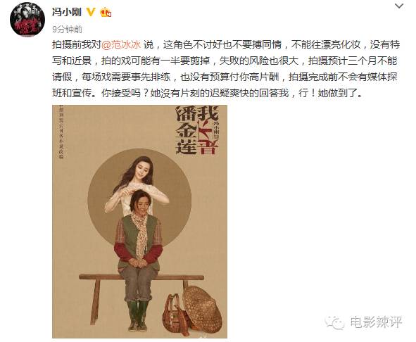 7月20日下午,冯小刚在微博晒出新戏《我不是潘金莲》海报,并配文阐述拍摄前对范冰冰已经打了“预防针”,坦言出演这部新剧牺牲会很大。最后冯导不忘盛赞范冰冰:“她做到了。”