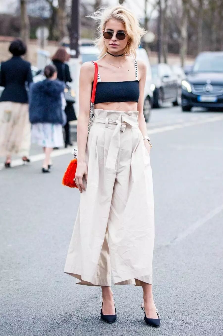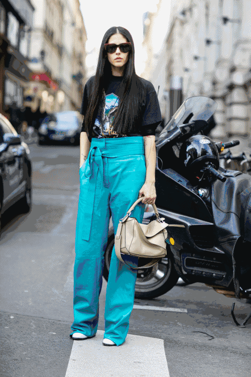 纸袋裤是高腰裤和阔腿裤的进阶版,配上腰带,就像用绳子封口的牛皮纸袋一样,有着超高腰的视觉效果。