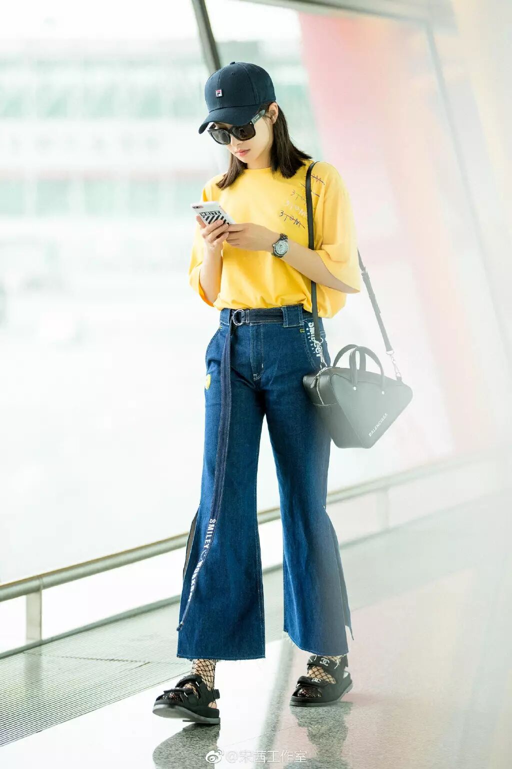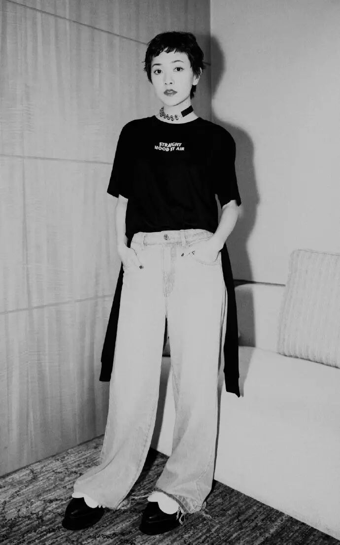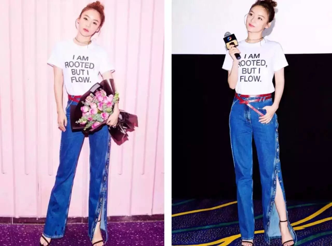 袁姗姗的牛仔阔腿裤开个衩搭配sloganT恤,加之choker和酒红色皮带装饰,酷感十足。