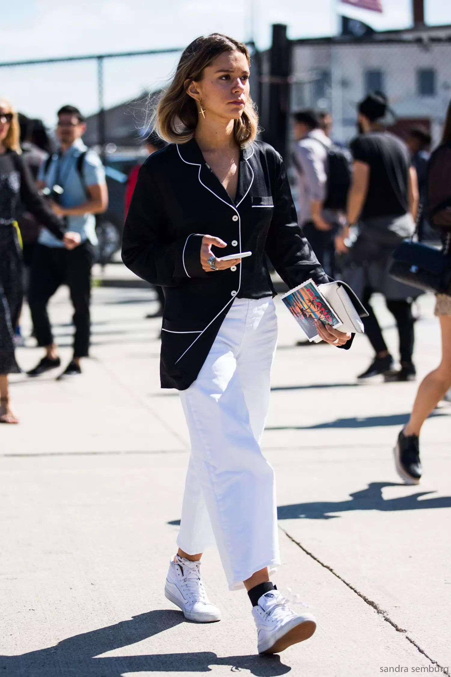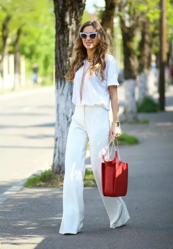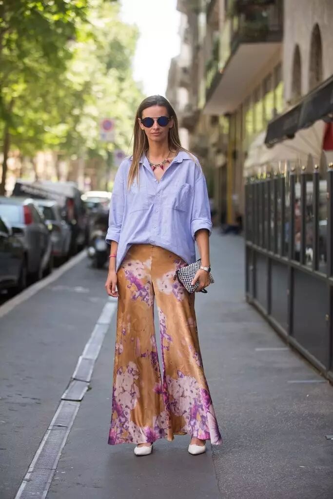 彩色条纹或者是印花阔腿裤,上身效果往往非常惊艳,搭配极简白衬衫或白T,就可以吸睛又不失高级质感。