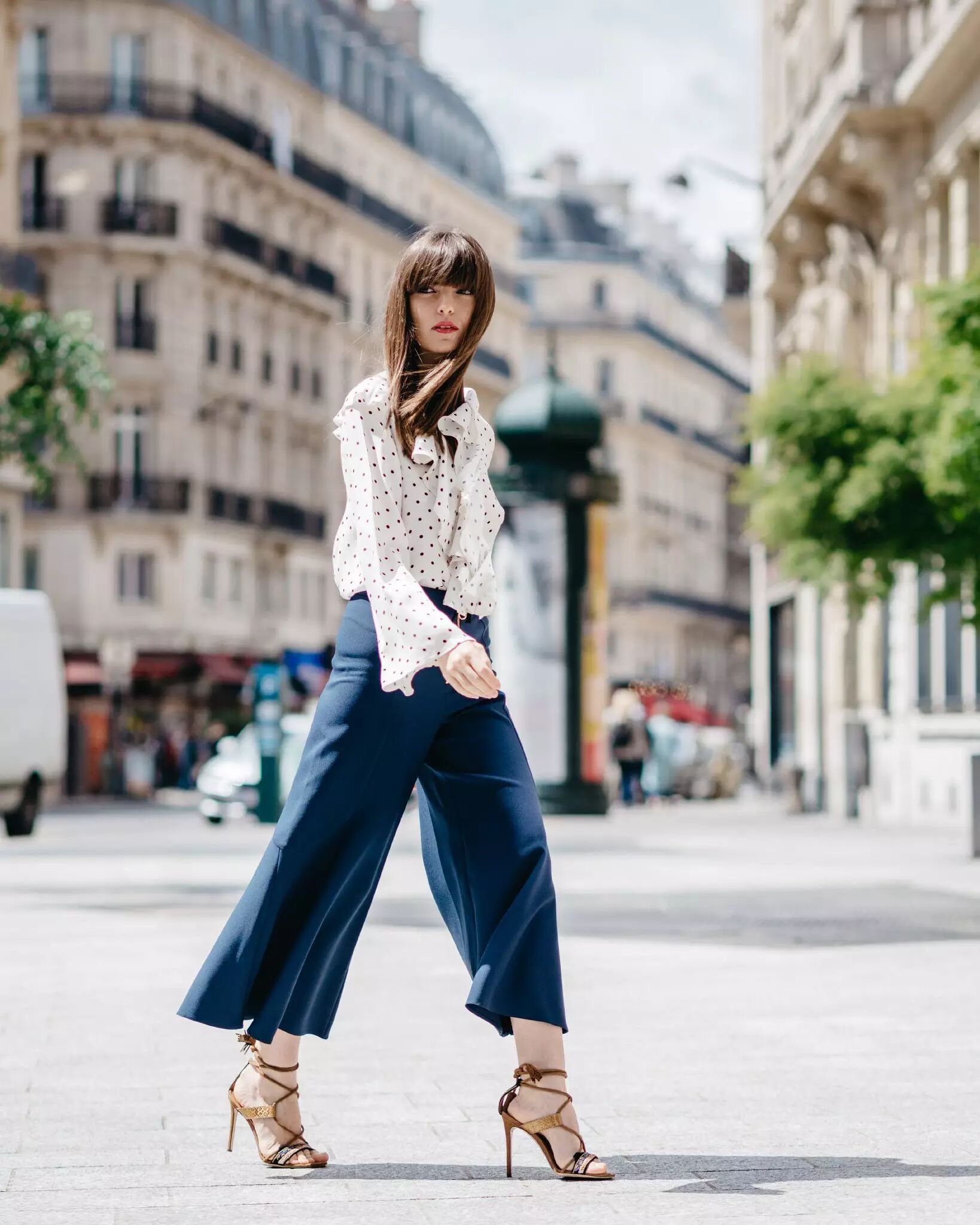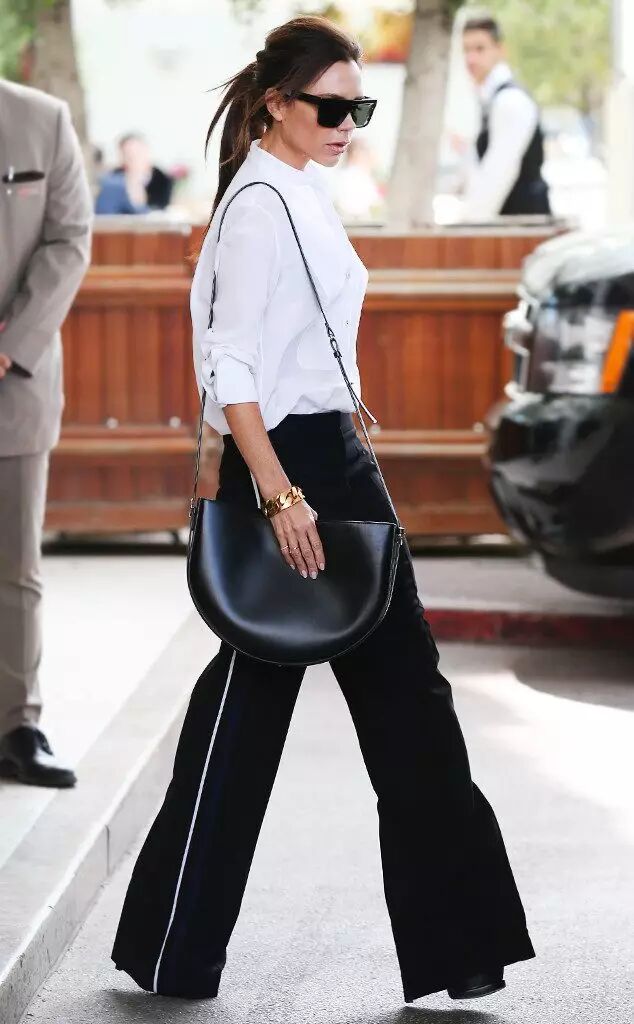 像贝嫂用正式感的白衬衫搭配阔腿裤,轻松打造出了干练知性的职业女性风采。
