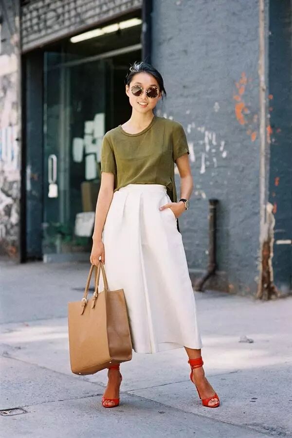 将宽版的阔腿裤再往外延伸就是SKANTS裤裙,柔和简约的伞状剪裁,不仅能有效修饰下盘问题,还能拉长腿部比例穿出修长感。