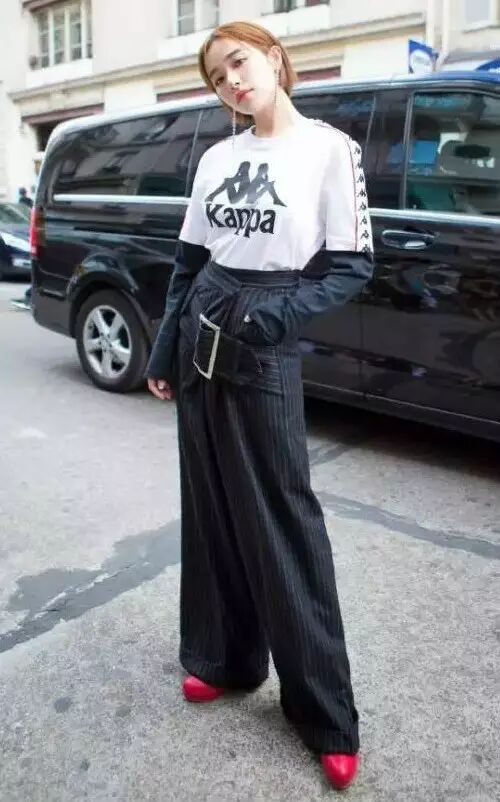 阚清子和郭采洁走的是复古运动风,超长的阔腿裤自带复古的气质,随意搭配复古T,也很有感觉。
