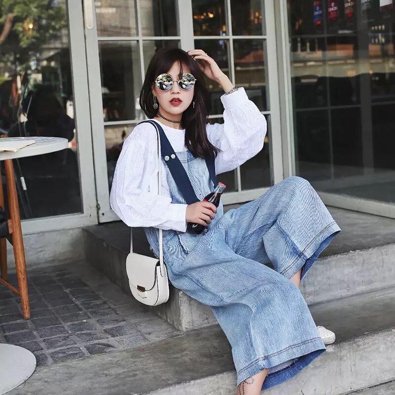 浅蓝色衬衫搭配牛仔背带阔腿裤,七分长度清爽利落,非常清新减龄