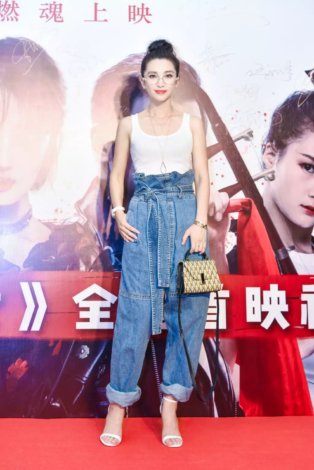 李冰冰身穿白色背心,下着Marni蓝色系带牛仔纸袋裤,脚踩Carvela白色一字带高跟凉鞋亮相,整体造型清爽干净。