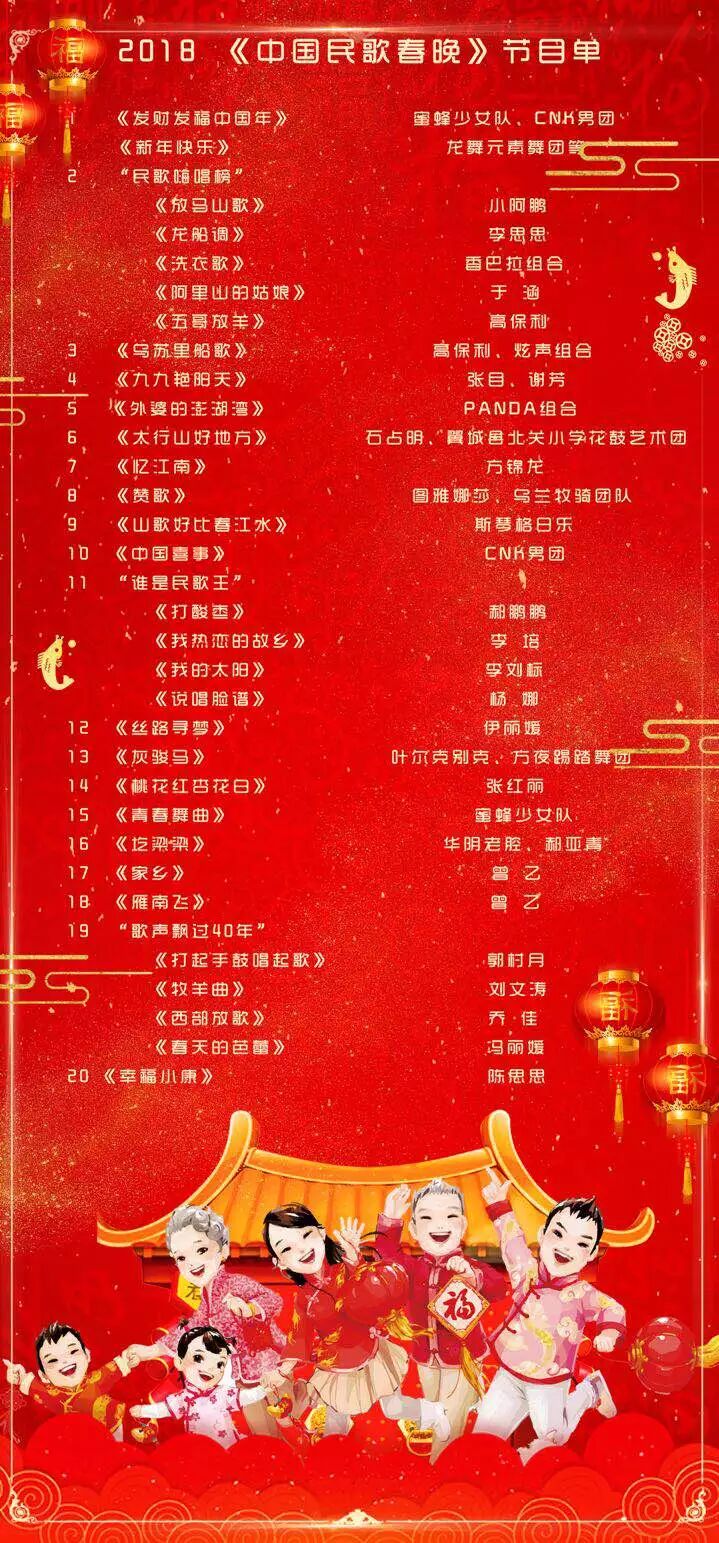 今年的民歌春晚力邀斯琴格日乐、陈思思、谢芳张目夫妇、华阴老腔、乌兰牧骑、汤非、石占明、高保利等嘉宾演绎动人民歌,还有炫声乐团、蜜蜂少女队、CNK男团新生力量为民歌注入无限活力,借助360度全包围炫目的舞美,人屏互动悱恻舞蹈,丝路之舞威亚飞天,引爆龙城新春。节目还请到了长治苹果姐、董山友父子等为代表的基层群众讲述自己的故事,展现基层百姓2018的幸福生活,在全国人民面前彰显三晋百姓的情怀,回味感受大爱山西。