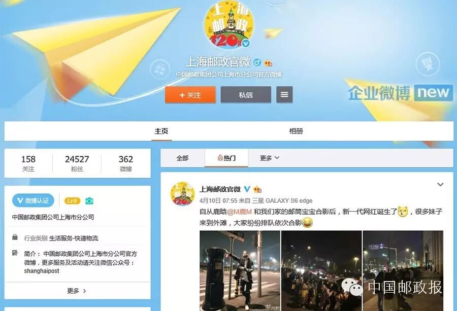 4月11日,上海邮政以个人名义在新浪微博注册了“外滩网红邮筒君”,首日便收获转发373条,评论115条,545个点赞。